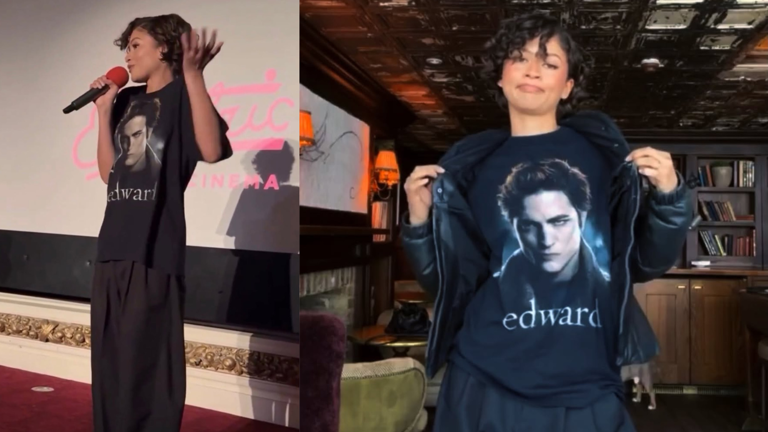 The latest A-lister to join the “Cullen Club” is Zendaya. On April 4, during a surprise appearance at a screening for her new A24 film The Drama in London, the actress stunned fans—not in a gown, but in an oversized black graphic tee. The shirt featured Pattinson’s iconic, brooding face as Edward Cullen. Styled by Law Roach and paired with tailored black slacks and Maison Margiela Tabi flats, the look recontextualized 2000s fandom gear as a deliberate, fashion-forward statement. The internet, predictably, lost its collective mind over the high-low styling.
